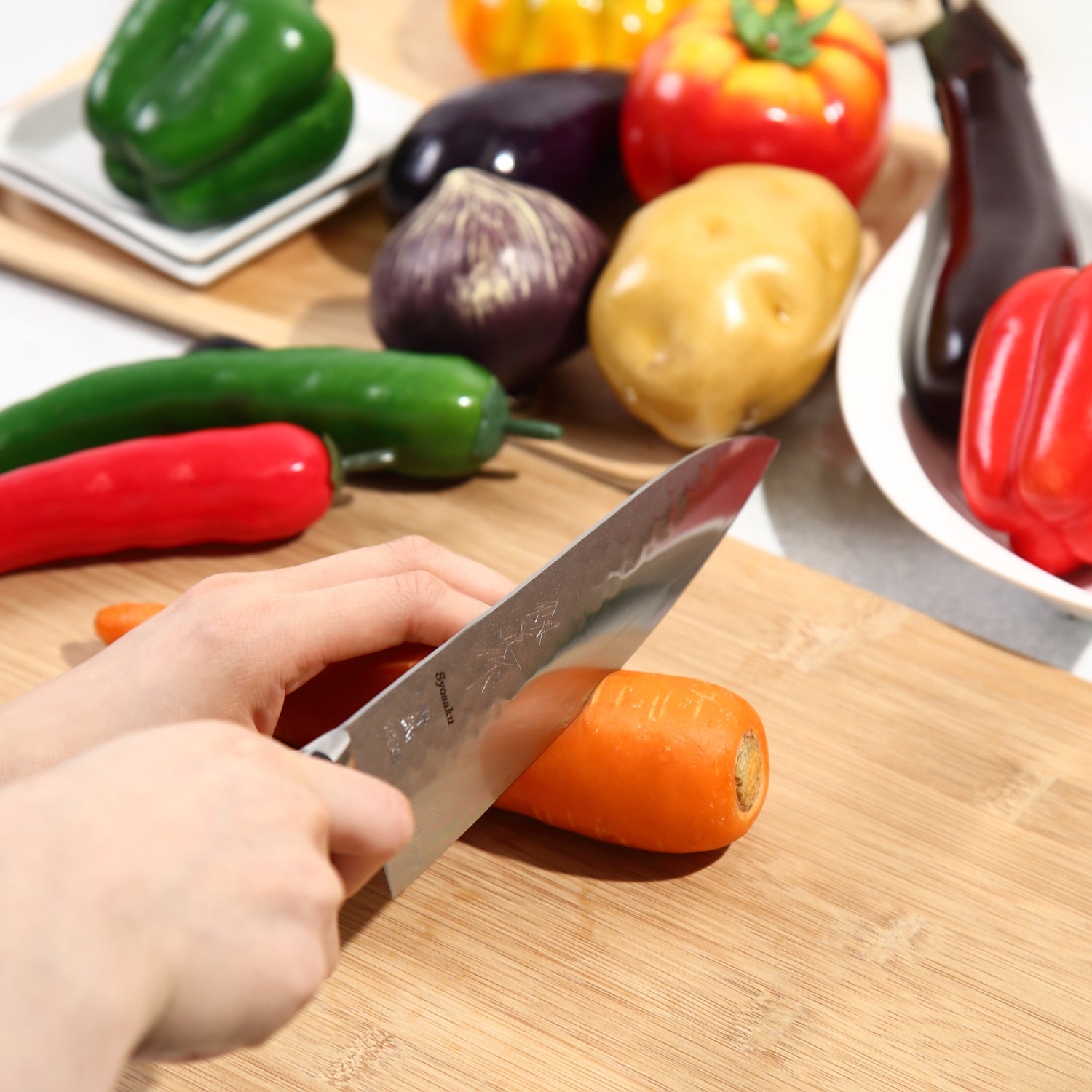 2. RAZOR SHARPNESS - Ready to use out of the box with ruthless sharpness. The core is Yasuki Aoko(Blue Steel)-No.2 high carbon steel (HRC 62-63), which is sandwiched between two layers of stainless steel by the traditional Warikomi method. It gives exceptional sharpness, edge retention, durability, and ease of sharpening at the same time. You can easily feel your upgraded technique level just by using a Syosaku Gyutou (Chef's) Knife. Hand wash only and regularly sharpen on quality whetstones.