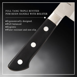 4. DURABILITY AND EASE OF USE - Both the core and outer steels are stain & corrosion resistant. The handle is triple riveted POM resin with hygienic 18-8 stainless steel bolster. It is water-resistant and non-slip. The combination gives exceptional strength & durability. You don't have to worry when it is left wet during its use (recommended to wash and dry after use). The ergonomically designed handle and perfectly balanced construction make you comfortable even for a long time use.