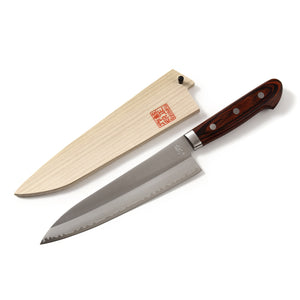A Gyutou (Chef's) Knife and a Magnolia Wood sheath with an ebony pin in a fancy box.