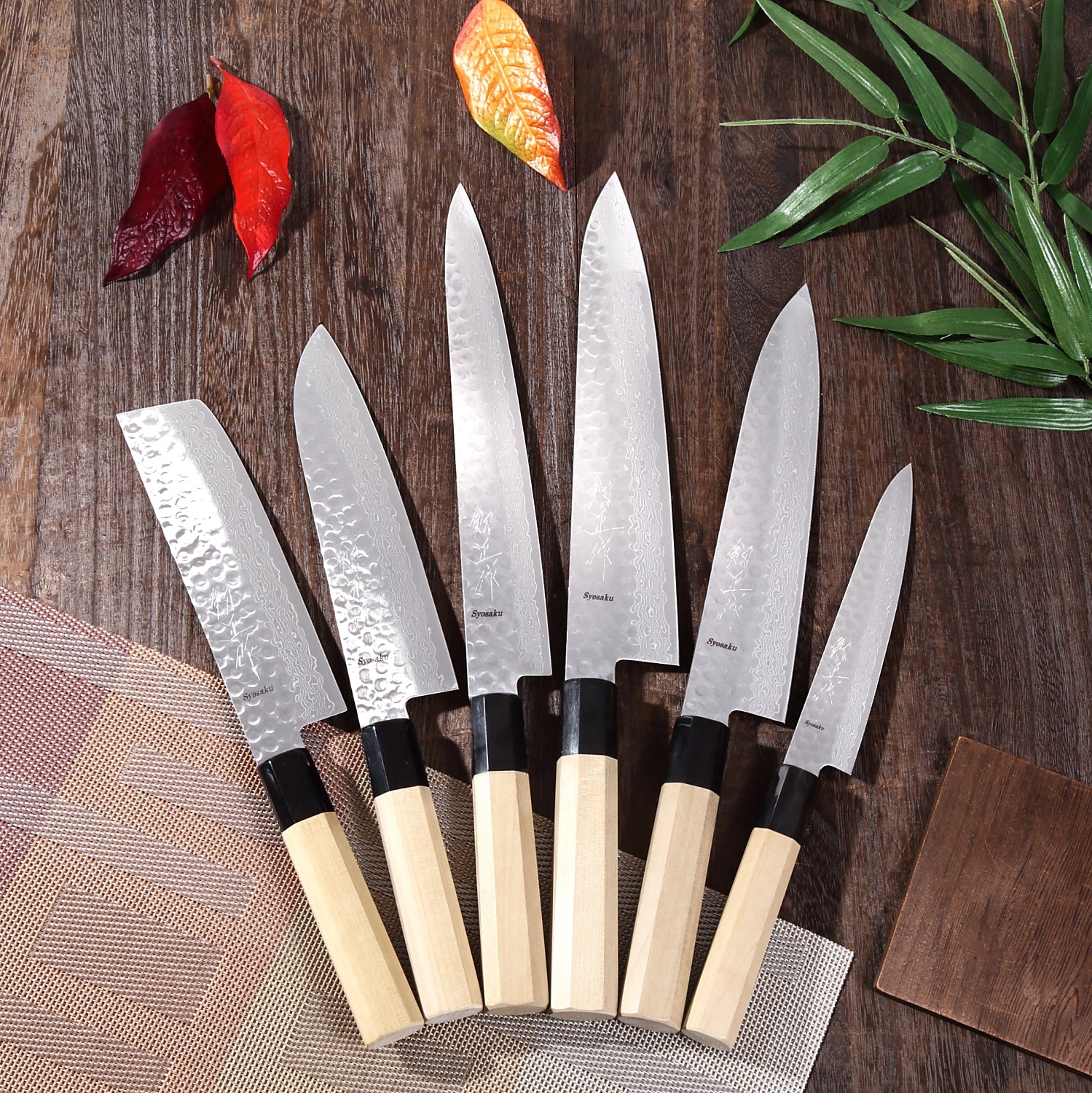 Syosaku Japanese Multi Purpose Best Sharp Kitchen Chef Knife Hammered Damascus VG-10 46 Layer Octagonal Magnolia Wood Handle, Santoku 7-inch (180mm)