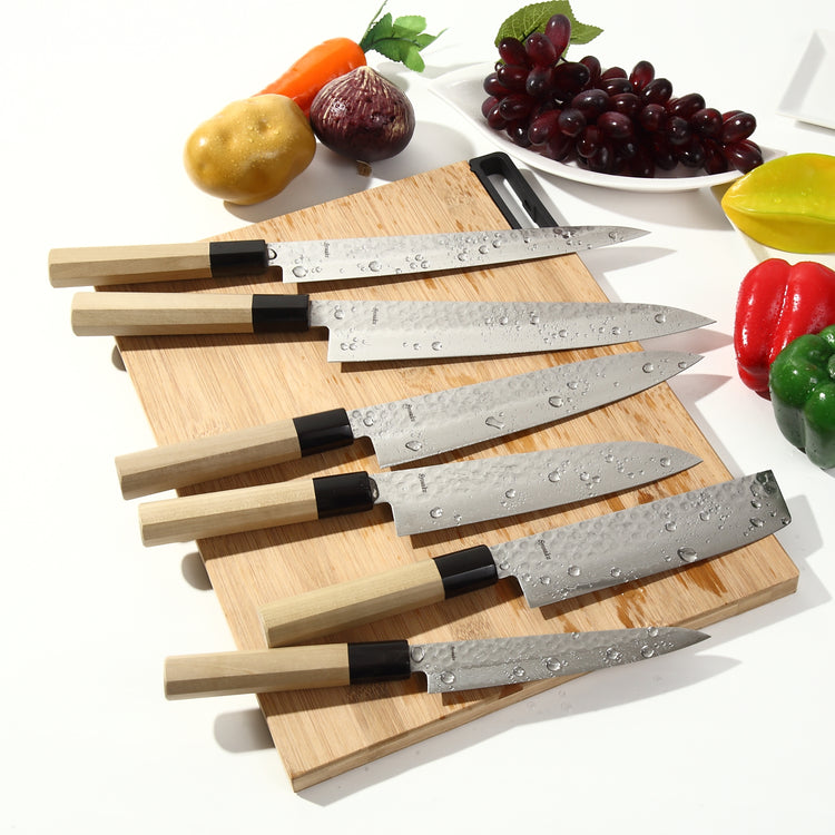4. DURABILITY AND EASE OF USE - Both the VG-10 core and outer Damascus steel are stain & corrosion resistant. The material used for the handle is taken from center core of Magnolia wood, which is water-resistant and non-slip. You don't have to worry when it is left wet during use (recommended to wash and dry after use). The ergonomically designed Octagonal handle and perfectly balanced construction make you comfortable even for a long time use.