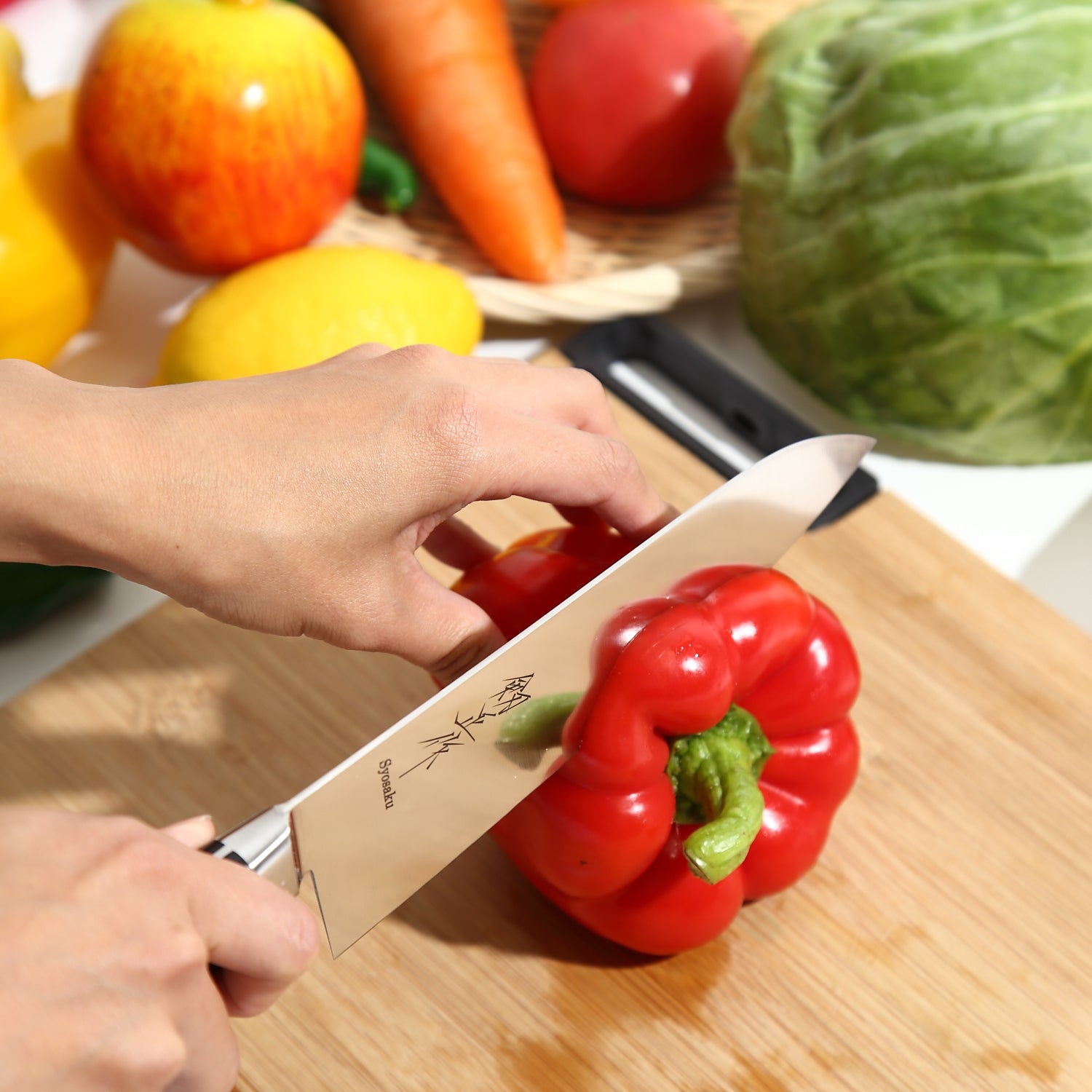 2. RAZOR SHARPNESS - Ready to use out of the box with ruthless sharpness. The core is INOX AUS-8A Molybdenum Vanadium stainless steel, which gives exceptional sharpness, edge retention, durability, and ease of sharpening at the same time. You can easily feel your upgraded technique level just by using a Syosaku Knife. Regularly sharpen on quality whetstones. Hand wash with mild cleanser.
