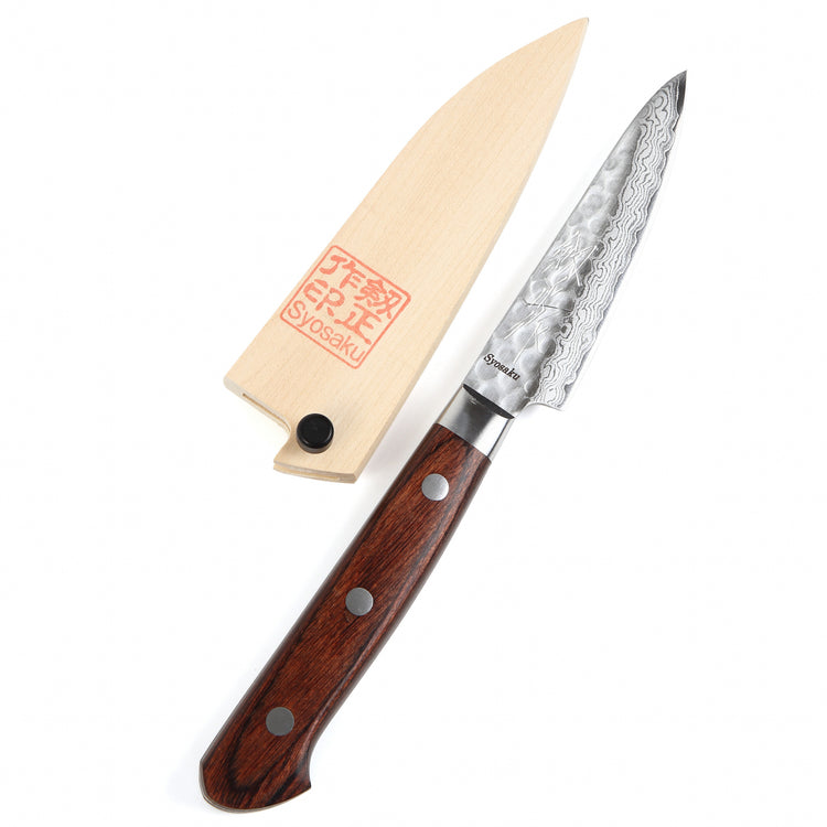 Syosaku Japanese Paring Best Sharp Kitchen Chef Knife Hammered Damascus VG-10 16 Layer Mahogany Handle, 3-inch (80mm) with Magnolia Sheath Saya Cover