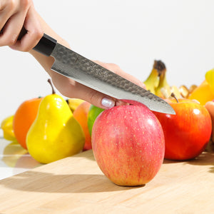4. DURABILITY AND EASE OF USE - Both the VG-10 core and outer Damascus steel are stain & corrosion resistant. The material used for the handle is taken from center core of Walnut tree, which is water-resistant and non-slip. You don't have to worry when it is left wet during use (recommended to wash and dry after use). The ergonomically designed Octagonal handle and perfectly balanced construction make you comfortable even for long-time use.