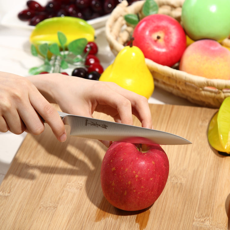 3. VERSATILITY - Ideal for everyday chefs handling daily kitchen tasks, whether professional or non-professional. Ultra-sharp medium size blade can be used as a smaller chef's knife or a larger paring knife. You can do any cutting tasks with one knife. You can use it as a sushi knife too. It is double-edged, so it doesn't matter if you are right-handed or left-handed. To avoid a chip in a blade, don't chop hard stuff like bones, nutshells, and frozen foods. Do not use on granite countertops.