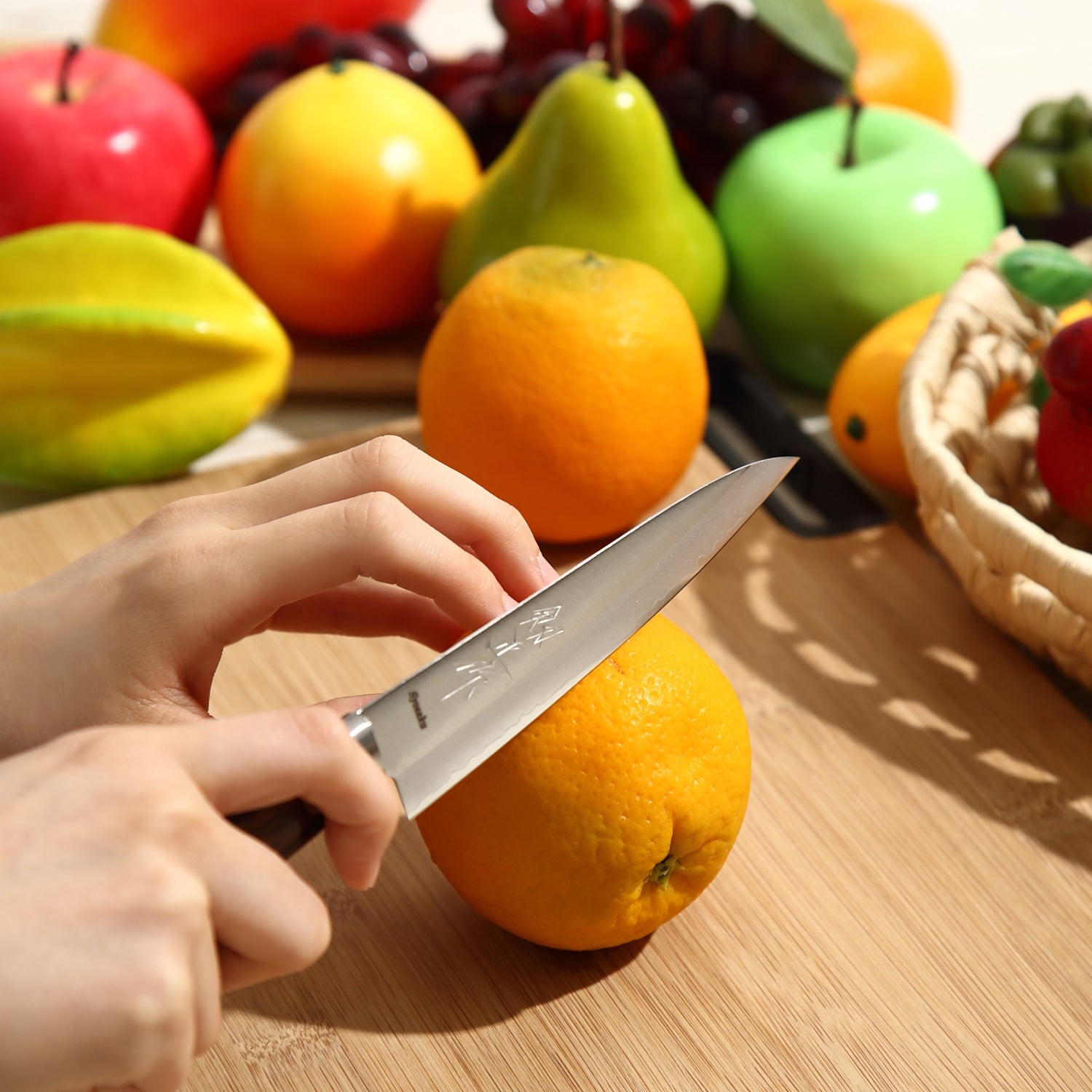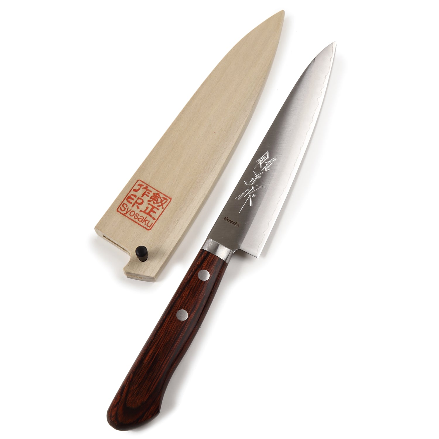 2. RAZOR SHARPNESS - Ready to use out of the box with ruthless sharpness. The core is Takefu VG-1 Gold high carbon stainless steel (HRC 60-62) produced in Fukui, Japan. The Warikomi construction gives exceptional sharpness, edge retention, durability, and ease of sharpening at the same time. You can easily feel your upgraded technique level just by using a Syosaku Petty Knife. Hand wash only and regularly sharpen on quality whetstones.
