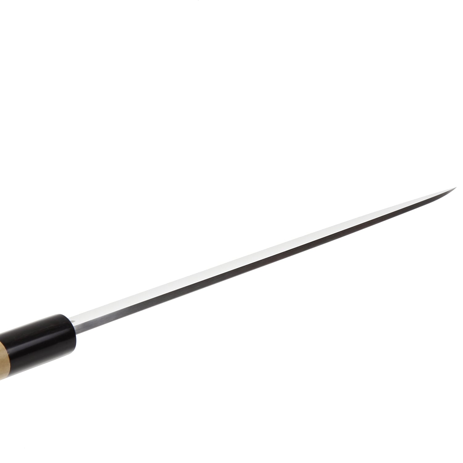 3. SUSHI SASHIMI SPECIALIST - The Yanagiba knife is designed to slice delicate fish for sushi and sashimi. The blade is made according to Japanese tradition, with Shinogi on the front side and Urasuki on the back. It effortlessly sails through fibers of fish flesh without a trace of crushing and tearing to produce a shining paper-thin slice with one stroke. The ergonomically designed D-shape Magnolia wood handle and perfectly balanced construction make you comfortable at each use.