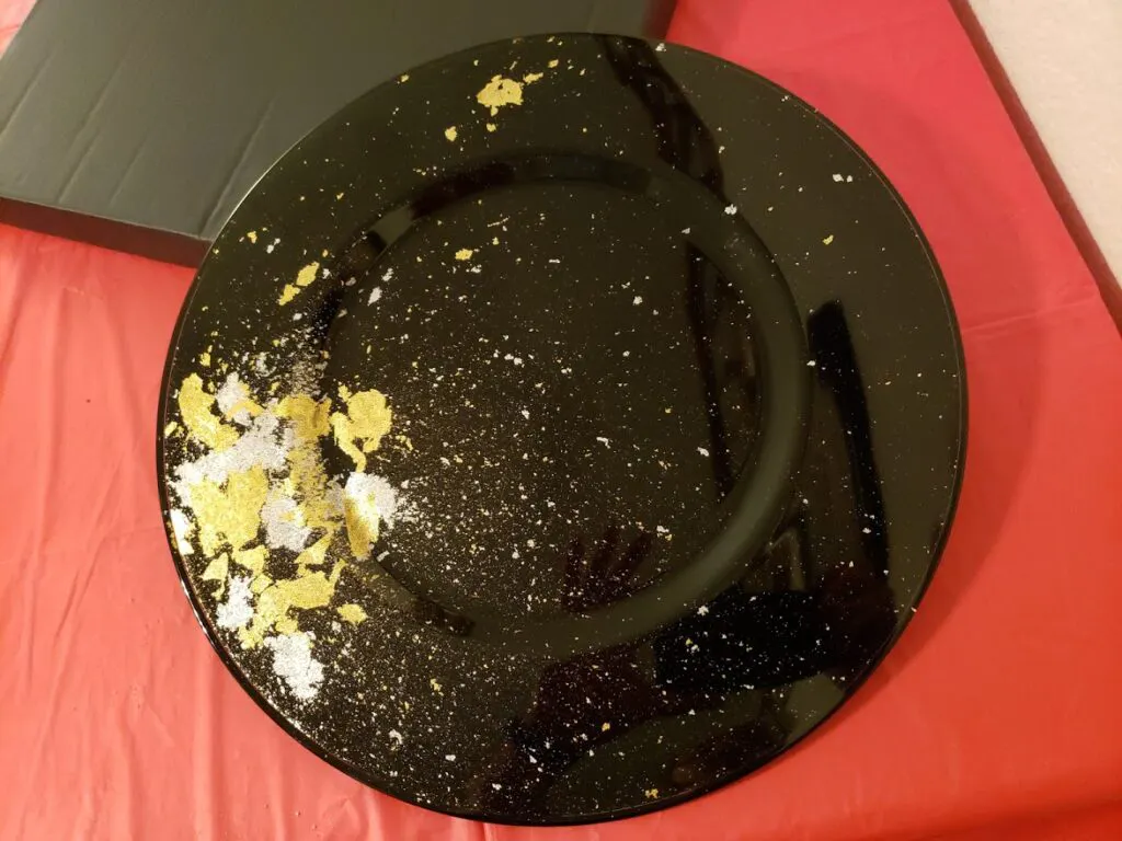 I got a charger plate for my wife Erin as a Christmas present, and its a beautiful example of Urushi craftsmanship with its striking splashes of gold leaf and powder over a black background."
