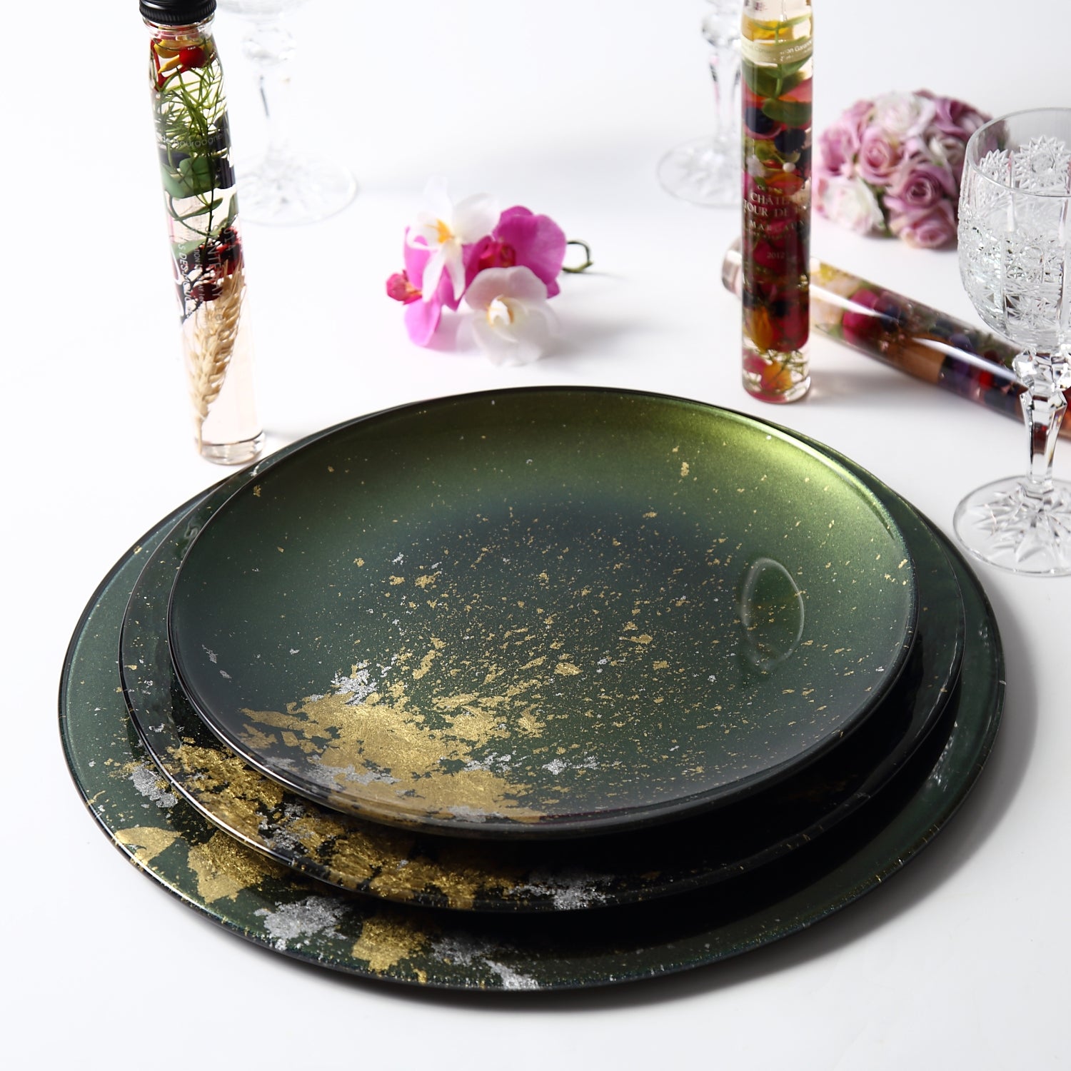 1. MORE THAN A PLATE - The one and only glamorous Majestic Green color with incredible depth is beyond comparison. The gorgeous gold leaf painting is handmade one by one by Japanese traditional Urushi artists. Slight ripple pattern on the glass surface makes the color even more brilliant. This is a glass plate like no other. It brightens up your table, bringing excitement even before the food is served. Share the enjoyment with your guests and loved ones. Dishwasher safe.