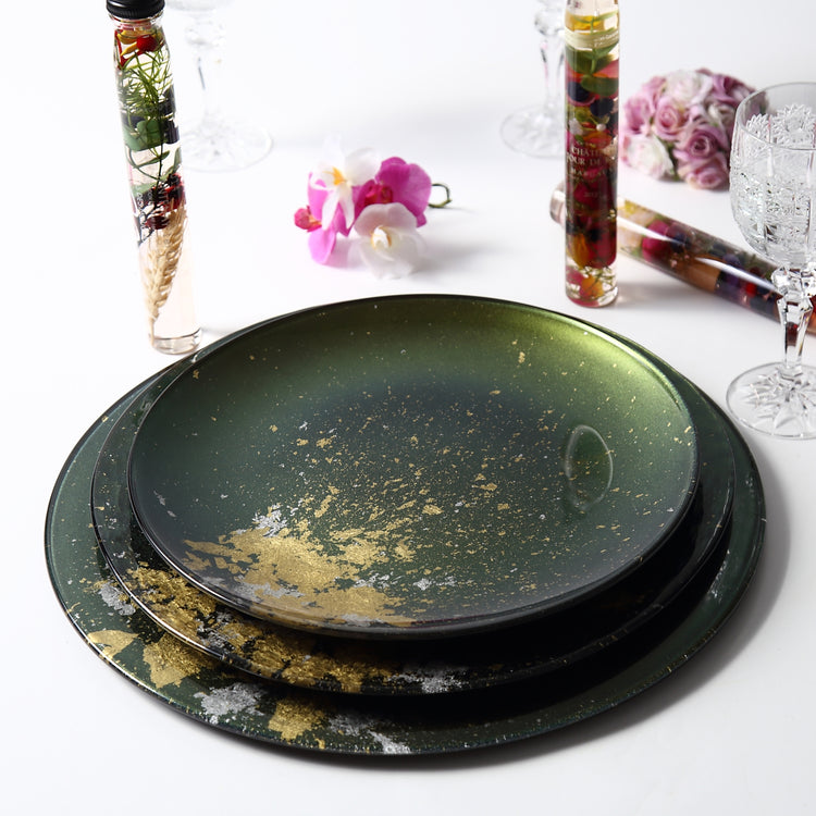 Syosaku Japanese Urushi Glass Dinner Plate 12.5-inch (32cm) Majestic Green with Gold Leaf, Dishwasher Safe