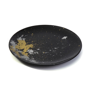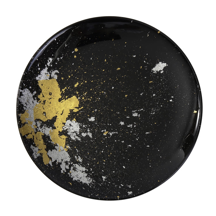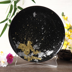 Syosaku Japanese Urushi Glass Flat Dinner Plate 11-inch (28cm) Jet Black with Gold Leaf, Dishwasher Safe