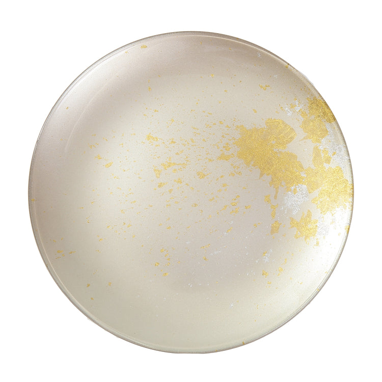 Syosaku Japanese Urushi Glass Flat Dinner Plate 11-inch (28cm) Majestic White with Gold Leaf, Dishwasher Safe