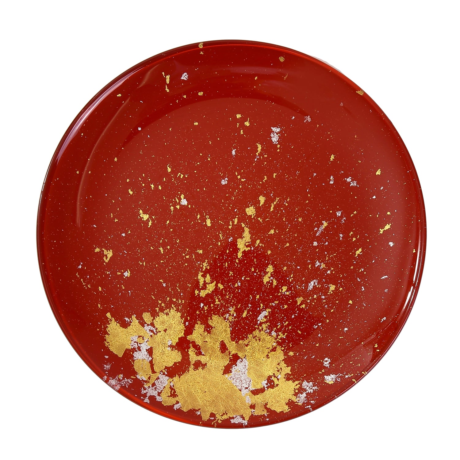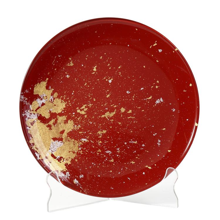 Syosaku Japanese Urushi Glass Flat Dinner Plate 11-inch (28cm) Vermilion with Gold Leaf, Dishwasher Safe