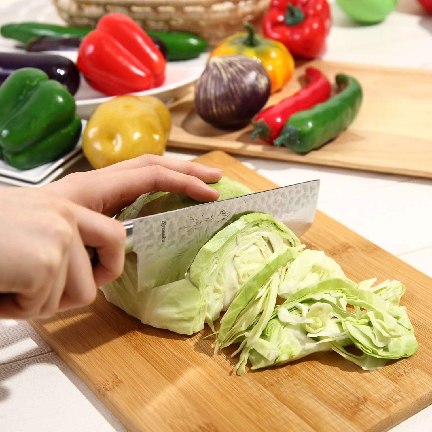 5. AESTHETICS AND 100% SATISFACTION GUARANTEE - An exquisite outer steel not only eliminates friction and keeps food from sticking to the blade, but also the beauty makes your cooking more enjoyable. An elegant Mahogany handle adds more visual accents. It brings refinement and style to any modern kitchen. Impress your guests with its stunning beauty. It is a perfect gift for your loved ones too. If you don't like our Syosaku Knife, please return it within 30 days of purchase for a full refund.