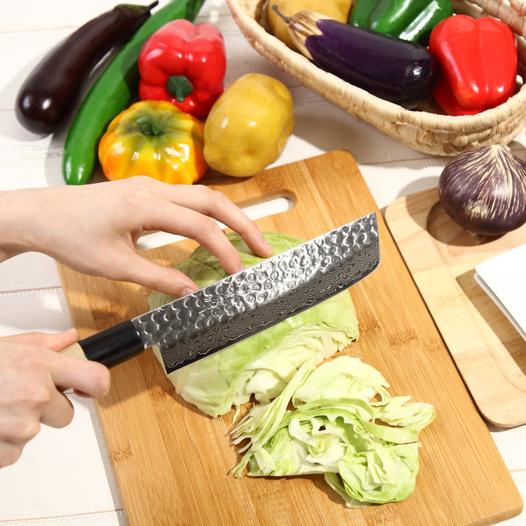 4. DURABILITY AND EASE OF USE - Both the VG-10 core and outer Damascus steel are stain & corrosion resistant. The material used for the handle is taken from center core of Magnolia wood, which is water-resistant and non-slip. You don't have to worry when it is left wet during use (recommended to wash and dry after use). The ergonomically designed D-shape handle and perfectly balanced construction make you comfortable even for a long time use.