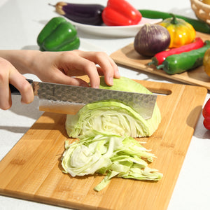 3. VEGETABLE SPECIALIST - The ultra sharp straight blade edge is designed to make a full contact with your cutting surface. It helps you to cut vegetables without sticking together like a thread. You can effortlessly slice delicate vegetables paper-thin, or quickly chop through hearty crisp vegetables. The wider blade is convenient for scooping them up for transfer after chopping. It is double-edged, so it doesn't matter if you are right-handed or left-handed. Do not use on granite countertops.