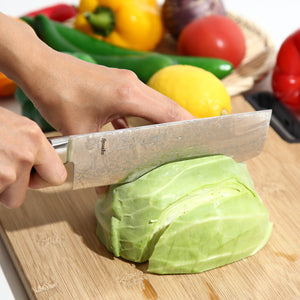 4. DURABILITY AND EASE OF USE - The VG-10 core and outer Damascus steel are stain & corrosion resistant. The premium Black Pakkawood used for the handle is water-resistant and non-slip. You don't have to worry when it is left wet during its use (recommended to wash and dry after use). The handle is triple riveted to the full tang, which gives exceptional strength & durability. The ergonomically designed handle and perfectly balanced construction make you comfortable even for a long time use.