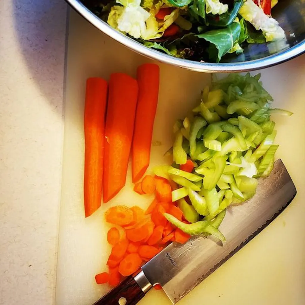 "Sous chef: I prepped the vegetables and chicken for a Super Bowl dinner Green Chile Chicken Soup to go with Tacos tonight. I used my complement of @syosakujapan3 Japanese knives -- Santoku, Nakiri and Sujihiki."